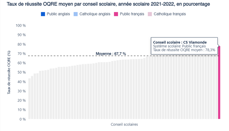 Viamonde célèbre son statut de chef de file pour l’excellence de son éducation et la réussite de ses élèves. Selon des données du Bureau de la responsabilité financière de l’Ontario qui présente en un seul tableau le positionnement de tous les conseils scolaires relativement aux taux de réussite des élèves aux tests normalisés de l’OQRE, le Conseil obtient la première place parmi les 72 conseils scolaires de la province.