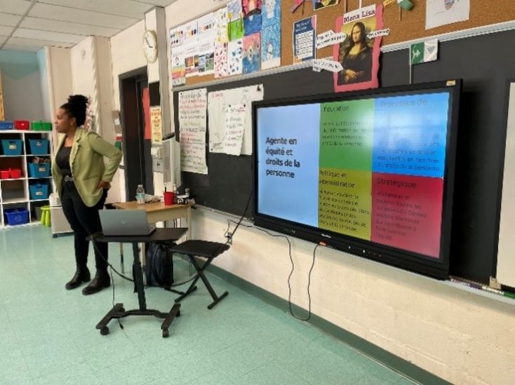 L’agente en équité et droits de la personne a rencontré des membres du personnel dans certaines écoles pour discuter de la situation actuelle entre Israël et La Palestine et de son impact sur le climat scolaire. Elle a également présenté sur le sujet du racisme anti-Noir. Ce fut l'occasion de fournir des informations, mais aussi de permettre au personnel de poser des questions.