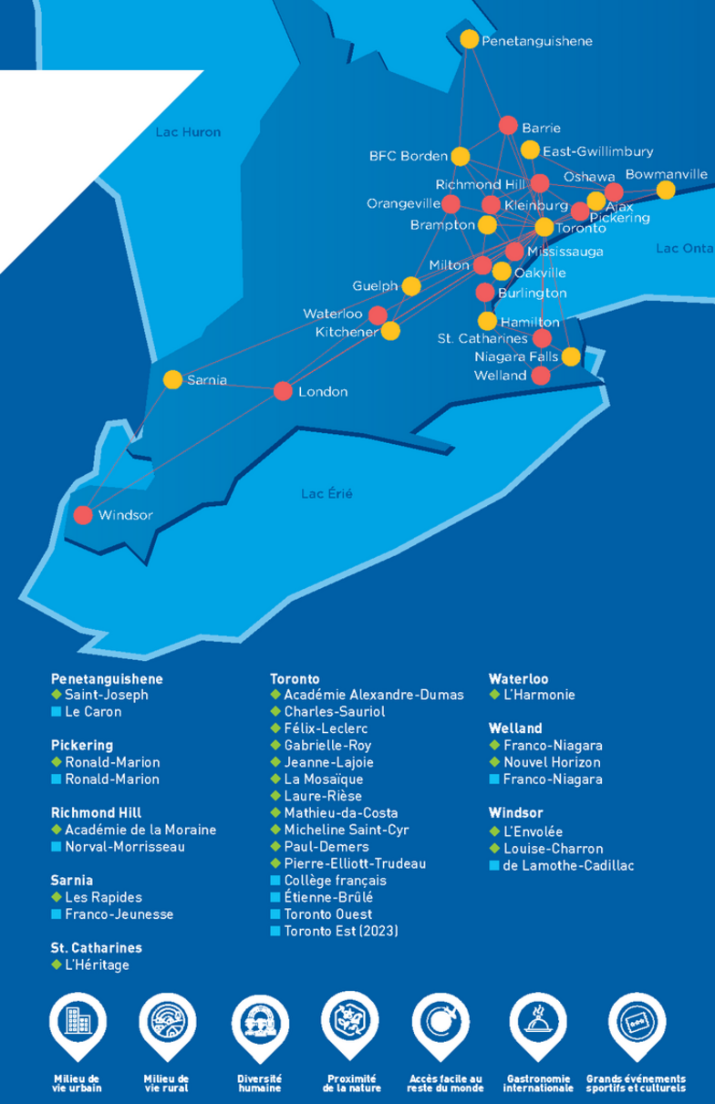 Le Conseil scolaire Viamonde est implanté dans le Centre-Sud-Ouest de l’Ontario, la zone la plus densément peuplée et la plus multiculturelle au Canada. Que vous soyez branchés par la vie en milieu urbain, son rythme, sa gastronomie internationale et ses grands événements ou par les banlieues et les régions rurales offrant de nombreux espaces verts où les gens prennent davantage le temps de respirer le grand air, Viamonde est établi dans plus de 26 localités en Ontario!