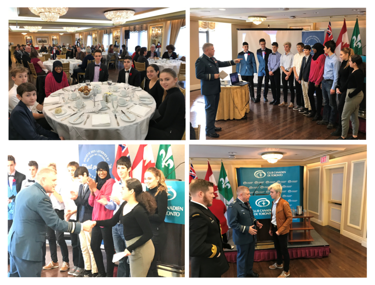 Toronto, le 10 novembre 2017 – En cette semaine de commémoration du jour du Souvenir, des élèves des écoles secondaires Étienne-Brûlé, Toronto Ouest et du Collège français de Toronto ainsi que des élèves de l’École secondaire Norval-Morrisseau de Richmond Hill ont assisté à une conférence sur les Forces armées canadiennes. Elles et ils ont écouté avec grand intérêt l’allocution du Lieutenant-général Alain Parent lors du déjeuner du Club canadien de Toronto.