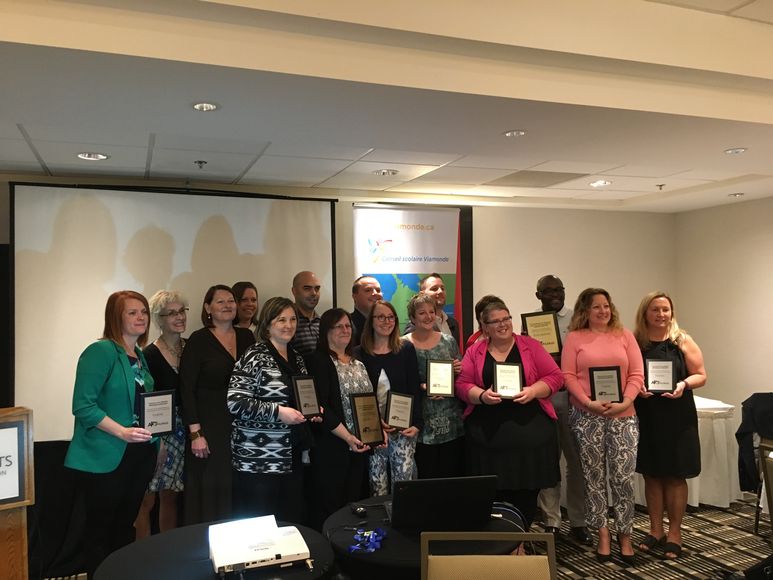 Toronto, le 25 mai 2017 – Grandes gagnantes de la 1re édition du concours ARTmonie du Conseil scolaire Viamonde, l’École élémentaire des Quatre-Rivières d’Orangeville et l’École secondaire Toronto Ouest ont reçu ce matin, des mains de M. Martin Bertrand, le prix du directeur de l’éducation.