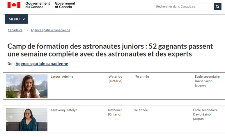 Toronto, 1 juin 2021- Adeline Latour, élève de 7e année, et Katelyn Xayavong, élève de 9e année de l’École secondaire David-Saint-Jacques de Kitchener ont été sélectionnées pour passer une semaine avec des astronautes, des ingénieurs et des scientifiques au Camp des astronautes juniors du Canada. Choisies par l’Agence spatiale canadienne, elles rejoindront en ligne une cinquantaine d’élèves de partout au pays pour des formations dans le domaine spatial.