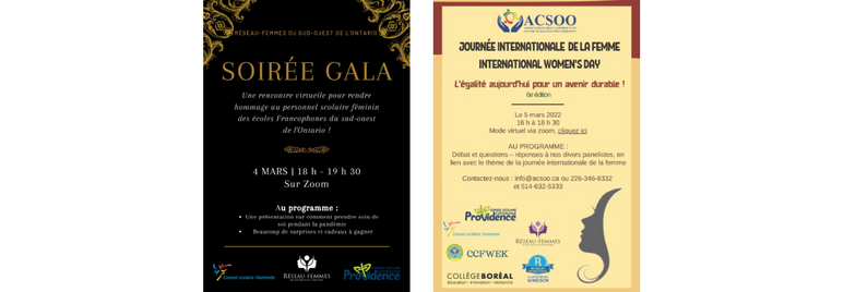 Le Réseau-femmes du sud-ouest de l’Ontarioopen_in_newCe lien s'ouvrira dans une nouvelle fenêtre (RFSOO), en concertation avec le Conseil scolaire Viamonde, a organisé une soirée de gala virtuelle pour rendre hommage au personnel scolaire féminin des écoles francophones des régions de Windsor, Sarnia et London. Lors de cet évènement, qui s’est tenu le vendredi 4 mars 2022, les participantes ont reçu une petite surprise en guise de remerciement pour tout ce qu’elles font et apportent au quotidien, surtout en ce moment de pandémie.