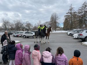 La communauté scolaire a ouvert les festivités avec des chansons et des poèmes dans le gymnase, puis les jeunes se sont rendus à tour de rôle devant l’école où elles et ils ont pu explorer une voiture de police et faire connaissance avec les chevaux de la police.