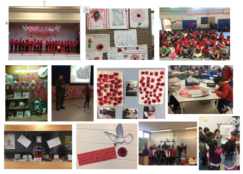 Pour rendre hommage aux soldats canadiens morts aux combats, les élèves ont participé à diverses activités telles que la confection de coquelicots, la lecture de poèmes, ou encore le visionnement de documentaires portant sur la Première Guerre mondiale. Nos élèves ont aussi appris, à l’aide de présentations interactives, l’importance de la participation des autochtones à l’effort de guerre.