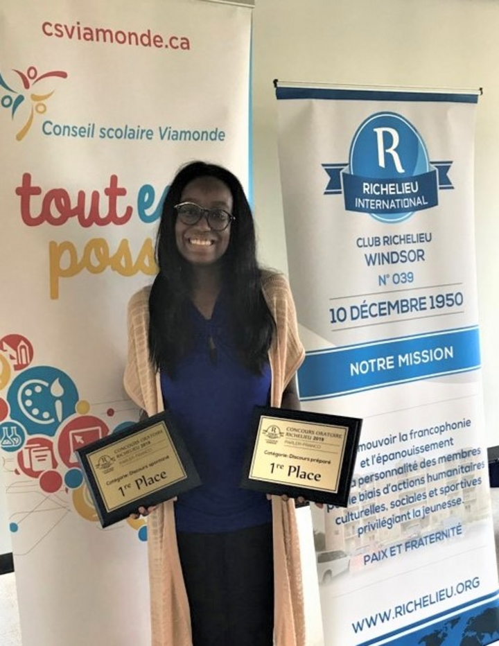Toronto, 3 mai 2019 – Victorieuse Sambao, élève de 8e année de l’École secondaire de Lamothe-Cadillac a épaté le jury en présentant des discours portant sur les parents adoptifs et le congé de paternité. Ces derniers lui ont valu la première place dans les catégories discours préparé et discours spontané, deux catégories très convoitées du concours…